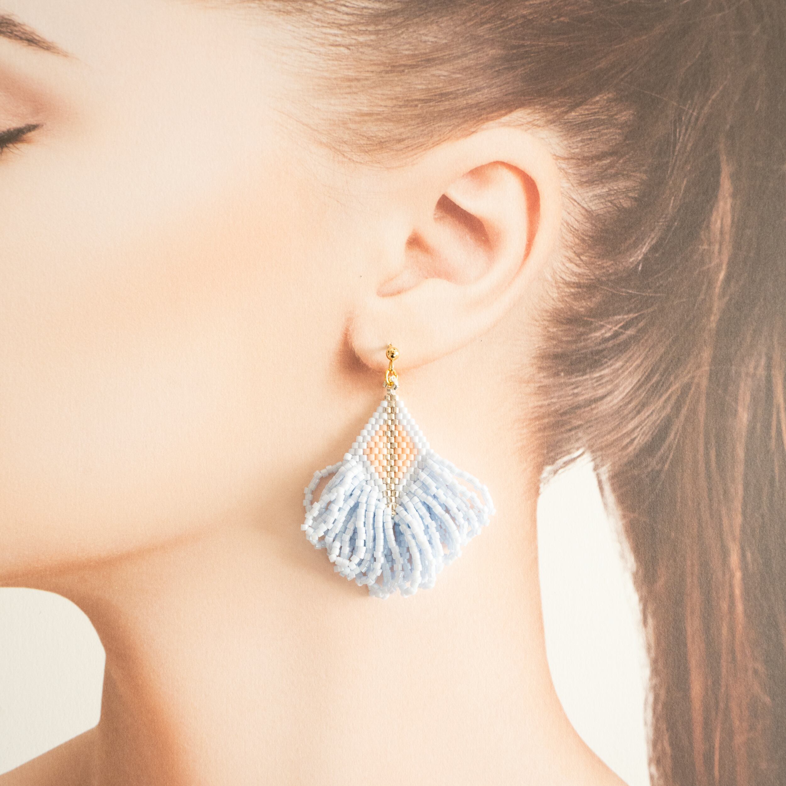 デリカビーズをたくさん使用しフリンジビーズピアスを制作しました。アイスブルーのお色にピンクの組み合わせが大人可愛いこちらのピアスは、シンプルなお洋服やカジュアルなお洋服にもぴったりで、季節を問わず合わすことができます☆他の作品と比べ短めのサイズになっており、より軽く仕上げました。ロングヘアでもショートヘアでもアクセントになります!風で揺れる雰囲気がとても可愛いピアスになっております!