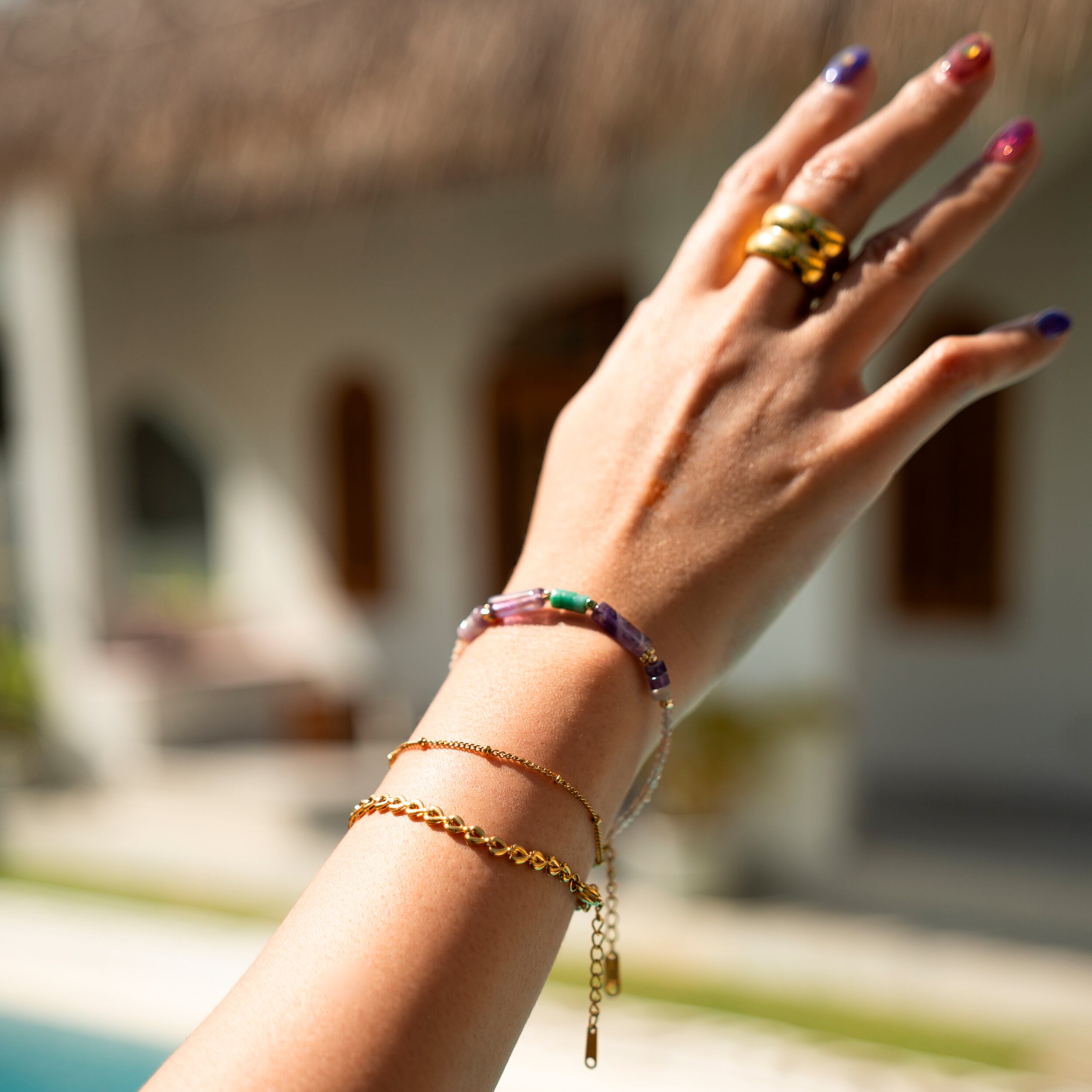 ターコイズブルーとパープルの天然石の組み合わせは爽やかでで可愛く、海が似合う雰囲気で制作しました♡また、チェーンブレスレットとの2連ブレスレットは重ね付けをしているかのように見えて存在感のあるアクセサリーです♡