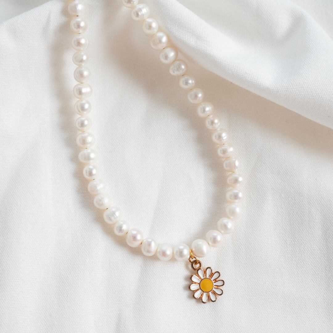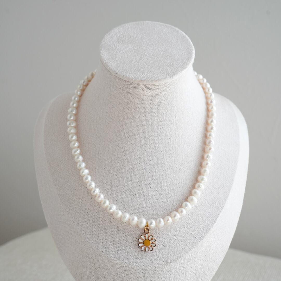 淡水パールを使用し、お花のチャームがワンポイントになったネックレスです♡不揃いの淡水パールが首元を華やかにしてくれます。シンプルなお洋服のアクセントにもなります!