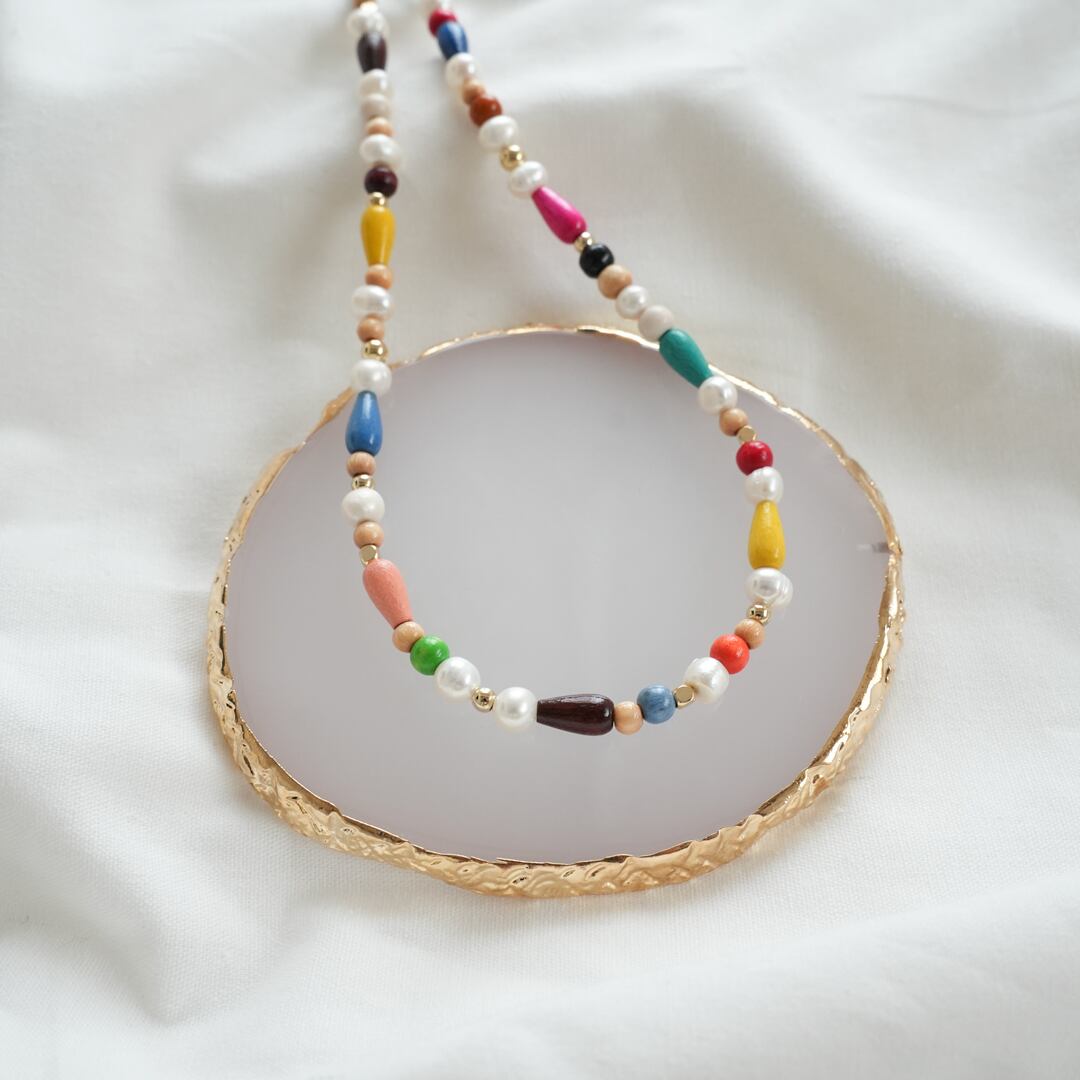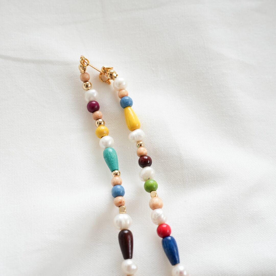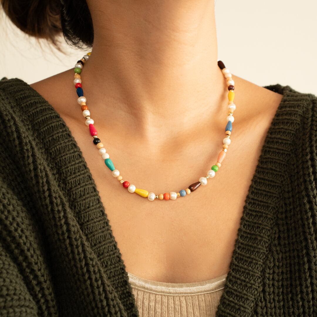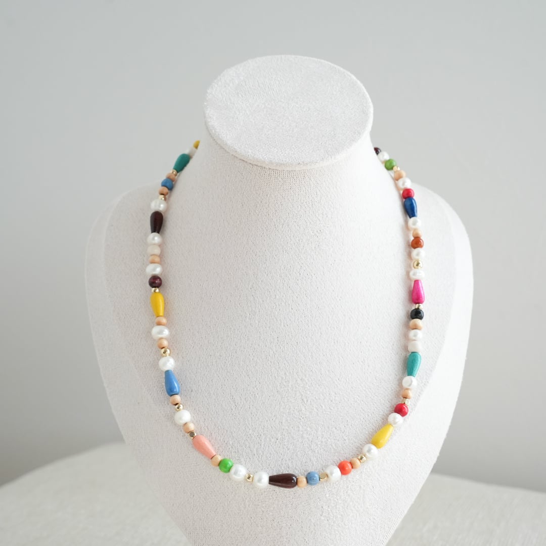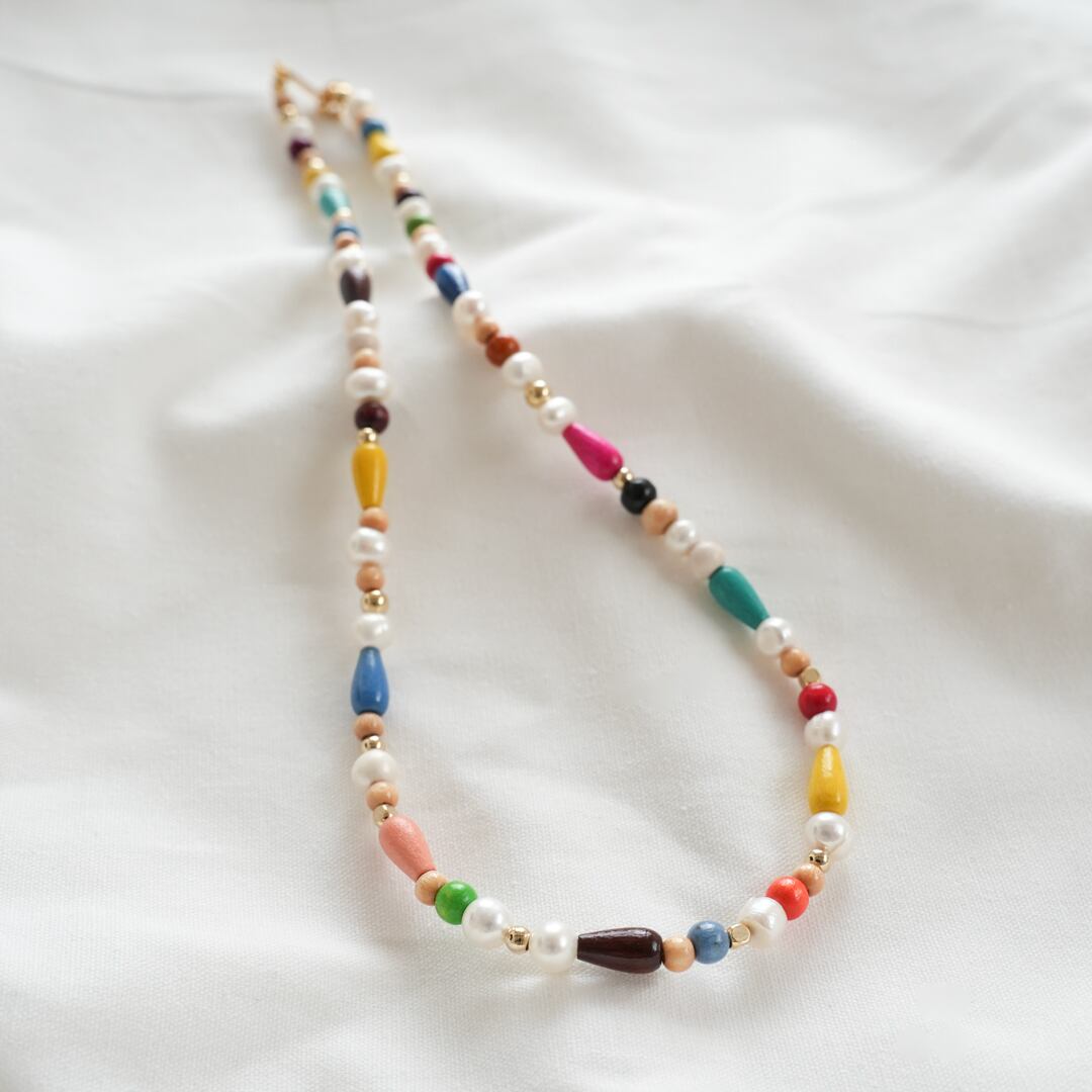 淡水パール・ウッドビーズ・メタルビーズを使用し、可愛らしくカラフルなネックレスを制作しました♡シンプルなお洋服に明るい印象を与えてくれます。また、お手持ちのネックレスにプラスするのもおすすめです☆