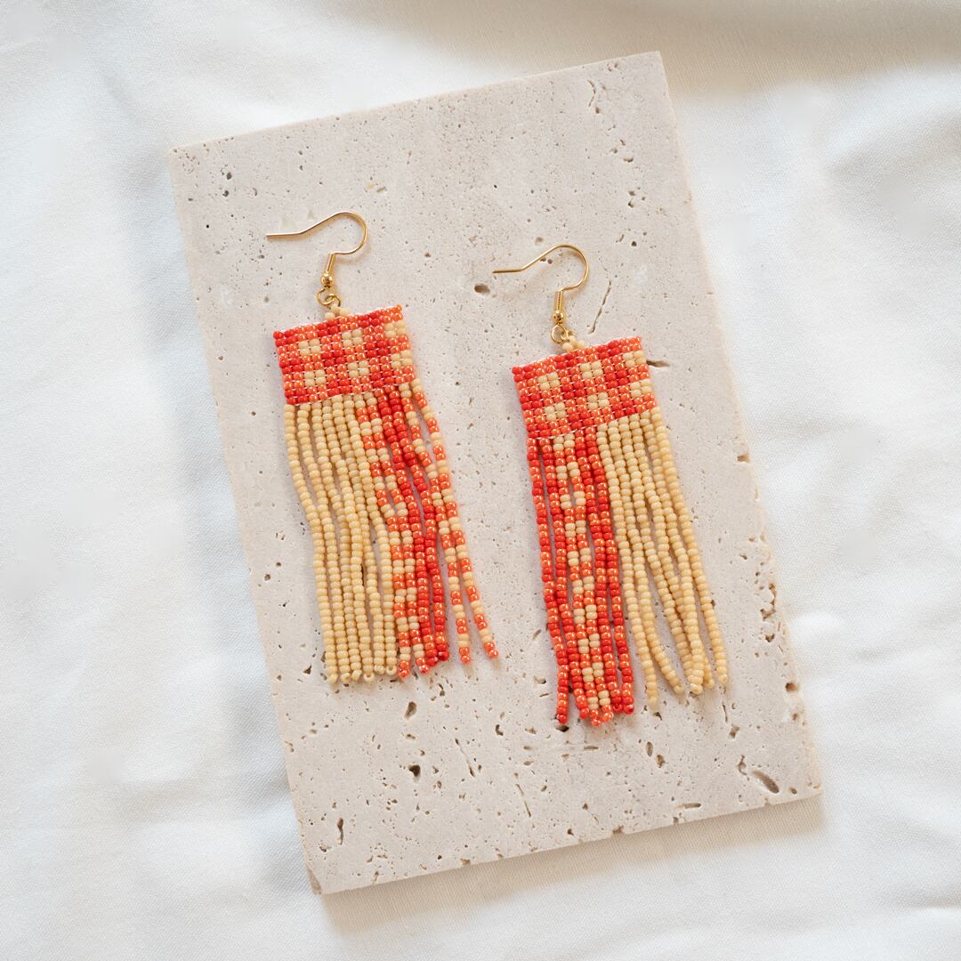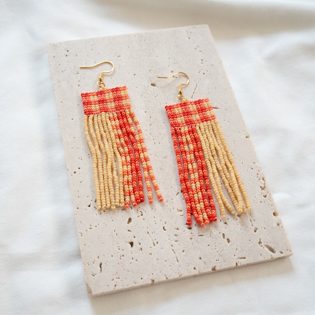 丸小ビーズをたくさん使用しフリンジビーズピアスを制作しました。赤色のチェック柄で目を引くような少し大きめのピアスとなっています。