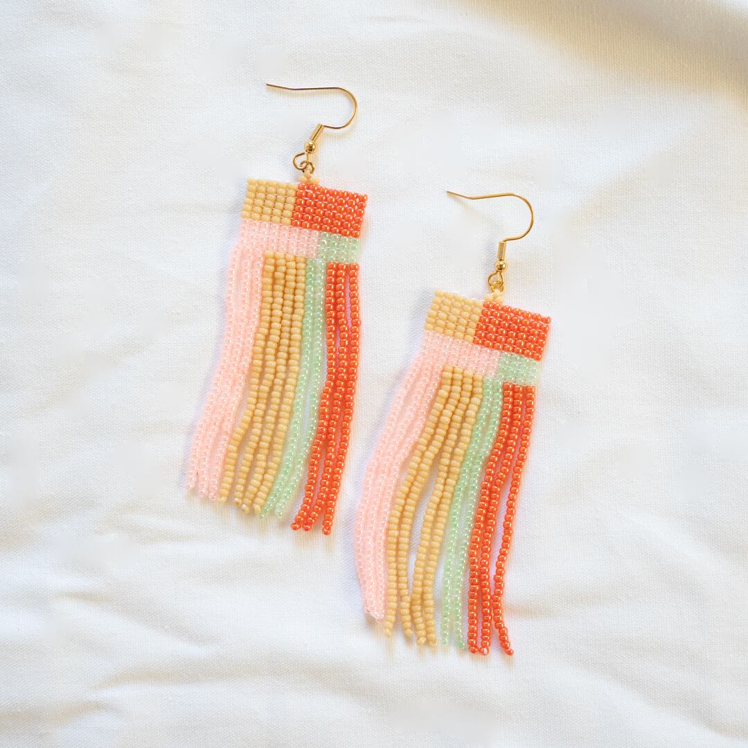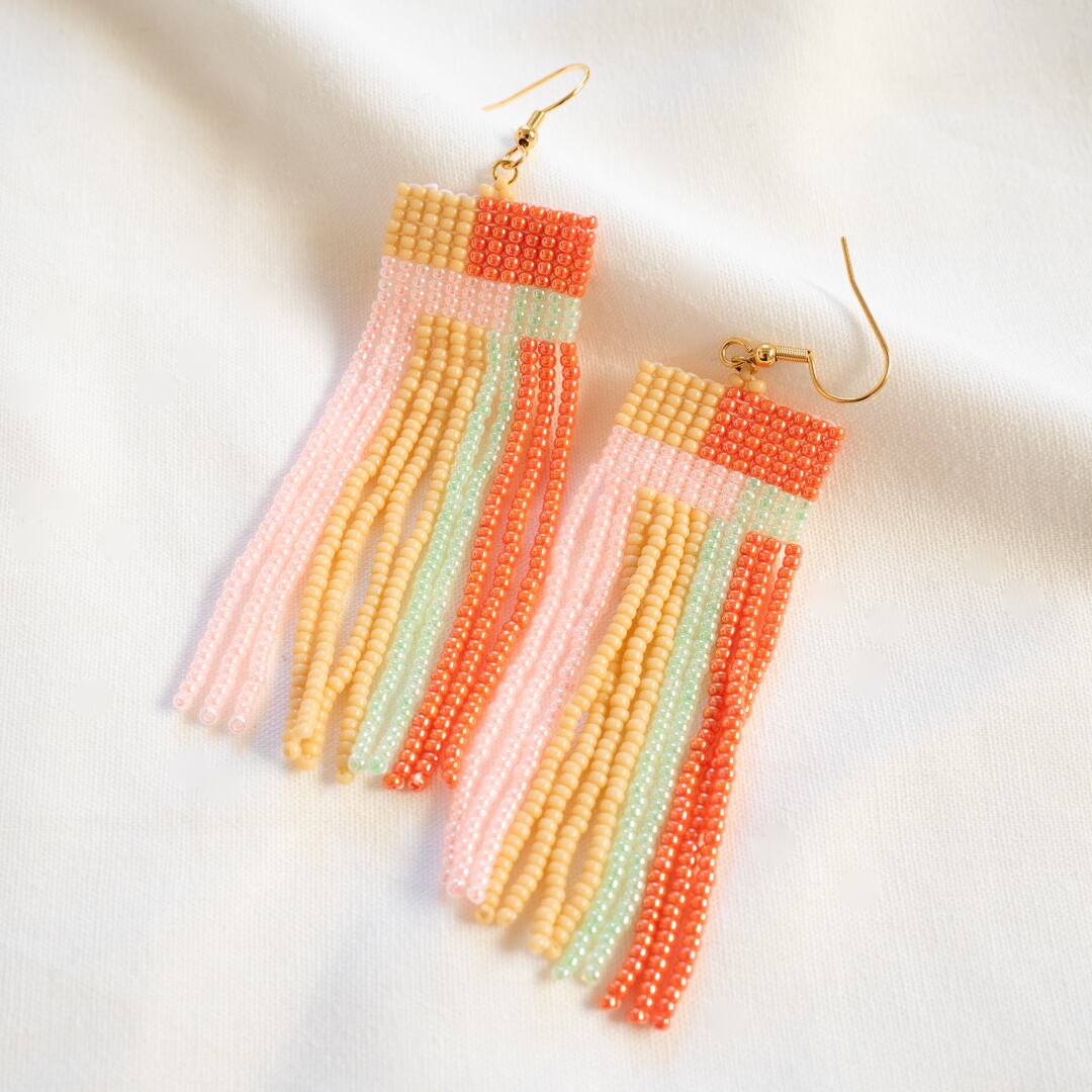 丸小ビーズをたくさん使用しフリンジビーズピアスを制作しました。グリーン×レッドとピンクベージュのコラボがなんとも可愛らしい少し大きめのピアスとなっています。