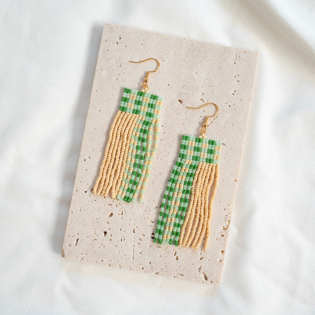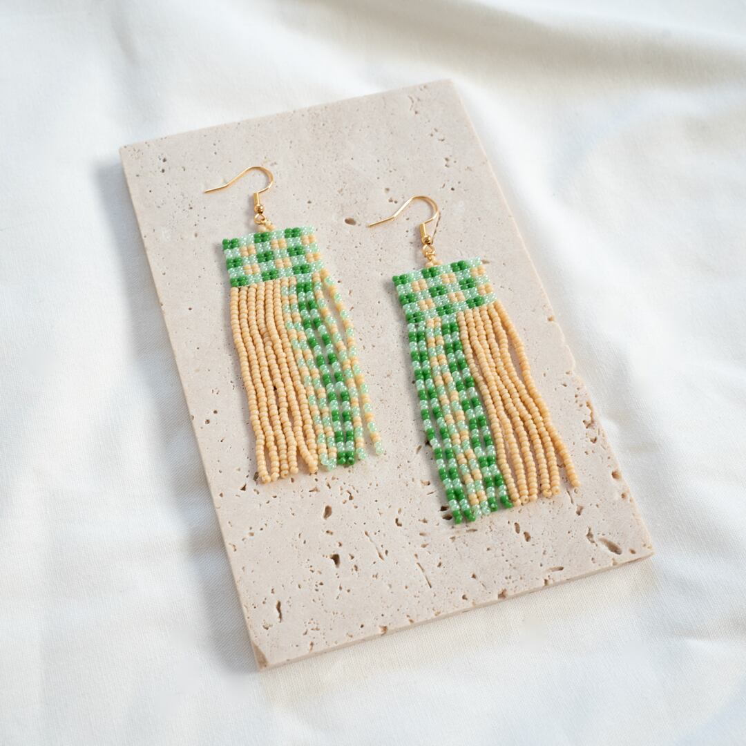 丸小ビーズをたくさん使用しフリンジビーズピアスを制作しました。グリーンのチェック柄で目を引くような少し大きめのピアスとなっています。