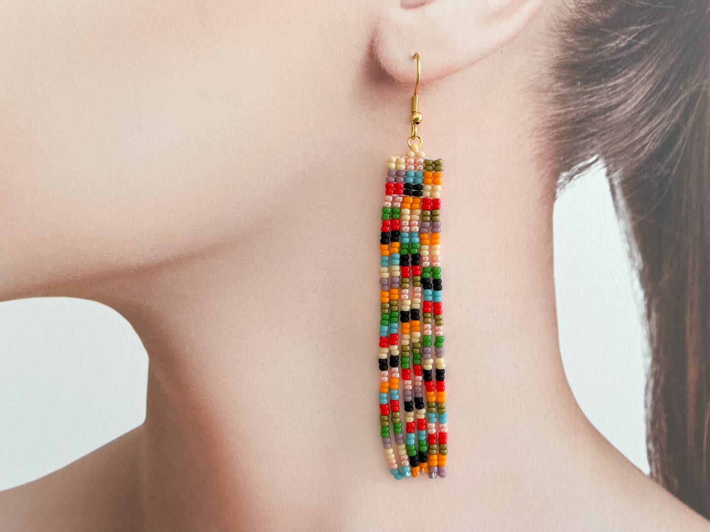 丸小ビーズをたくさん使用しカラフルなフリンジビーズピアスを制作しました。