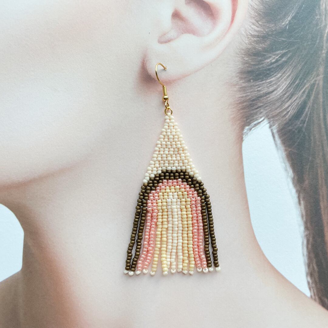 丸小ビーズをたくさん使用しフリンジビーズピアスを制作しました。虹をモチーフに少し大きめのフリンジピアスとなっております。