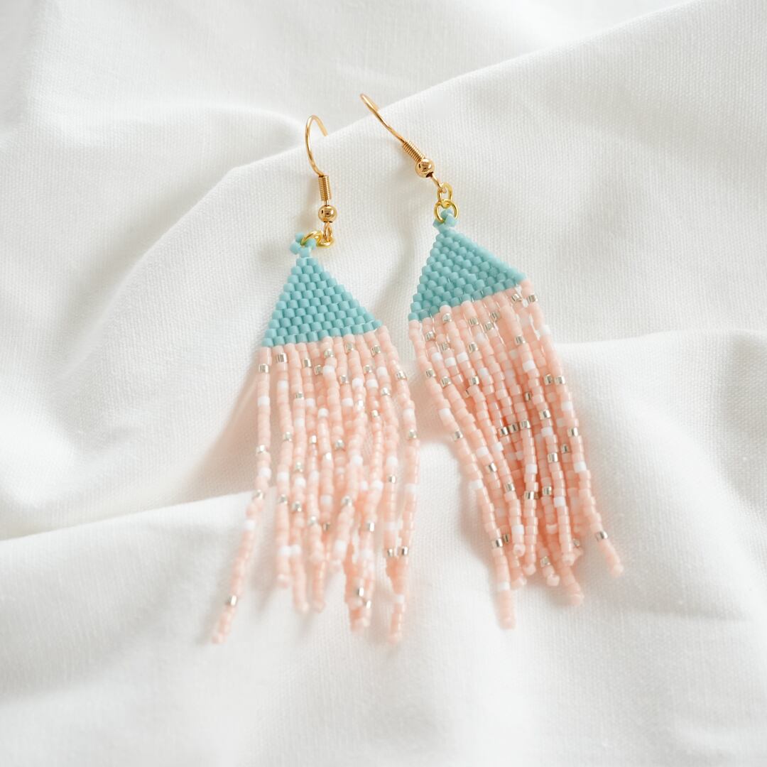 デリカビーズをたくさん使用しフリンジビーズピアスを制作しました。ピンクとブルーの組み合わせがとても可愛らしいピアスです☆また、シルバーのビーズも使用しているのでお顔周りの印象を明るくしてくれます☆他の作品と比べ短めのサイズになっており、より軽く仕上げました。