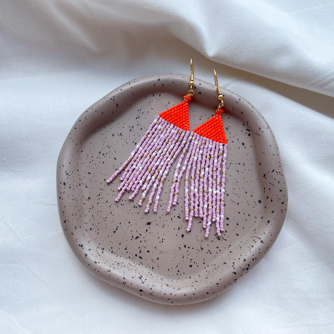 デリカビーズをたくさん使用しカラフルなフリンジビーズピアスを制作しました。オレンジとパープルの組み合わせがお顔周りの印象を明るくしてくれます☆また、他の作品と比べ短めのサイズになっており、より軽く仕上げました。