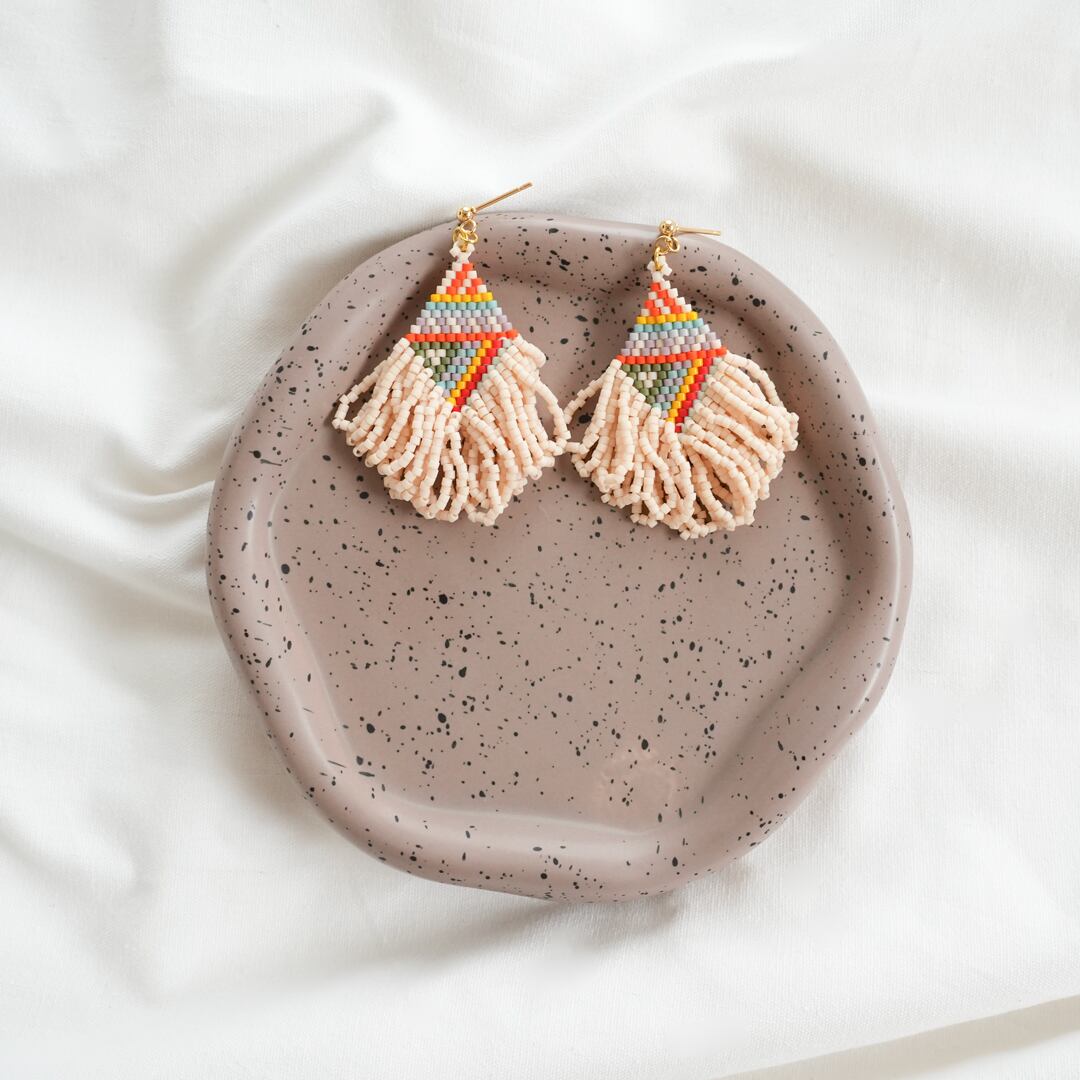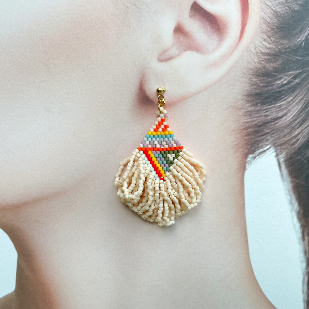 カラフルなデリカビーズをたくさん使用しフリンジビーズピアスを制作しました。シンプルなお洋服やカジュアルなお洋服にもぴったりで、季節を問わず合わすことができます☆他の作品と比べ短めのサイズになっており、より軽く仕上げました。ロングヘアでもショートヘアでもアクセントになります!風で揺れる雰囲気がとても可愛いピアスになっております!