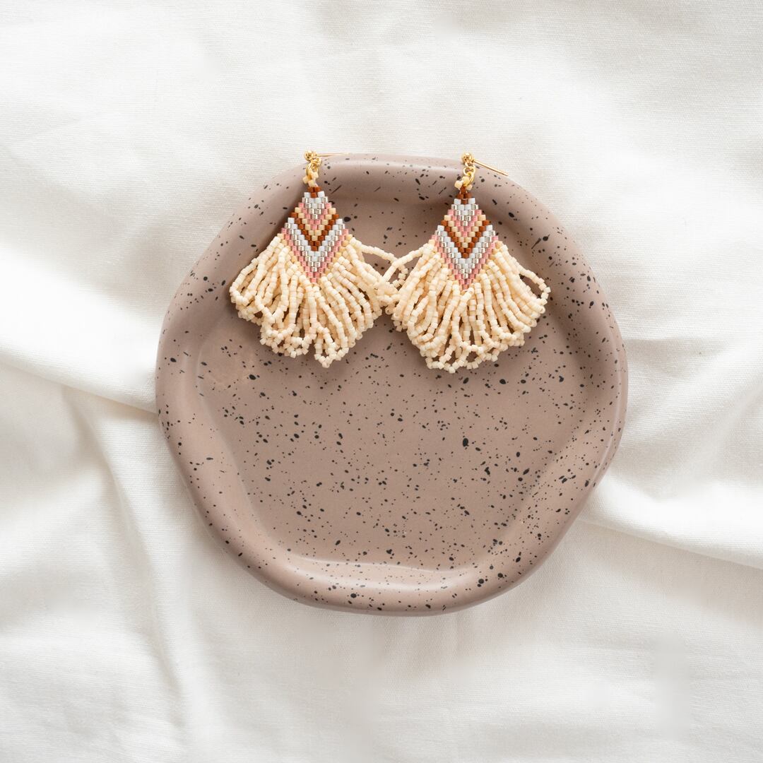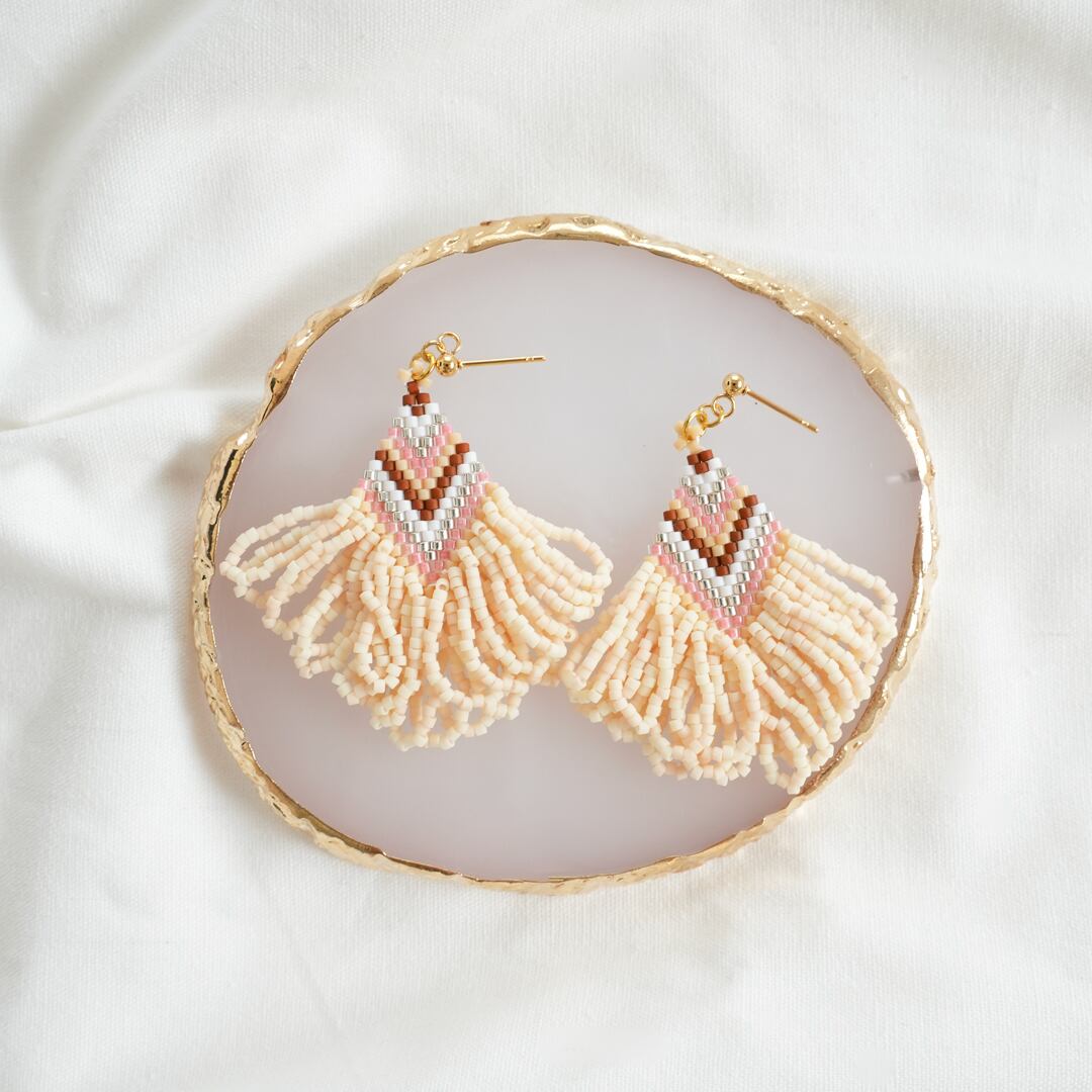 デリカビーズをたくさん使用しフリンジビーズピアスを制作しました。ピンク、シルバーの組み合わせは甘くなりすぎず、シンプルなお洋服やカジュアルなお洋服にもぴったりで、季節を問わず合わすことができます☆他の作品と比べ短めのサイズになっており、より軽く仕上げました。ロングヘアでもショートヘアでもアクセントになります!風で揺れる雰囲気がとても可愛いピアスになっております!