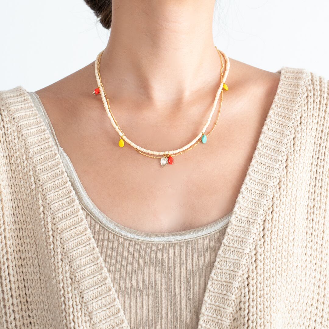 イエローが可愛いシェルビーズを使用し、2連ビーズネックレスを制作しました♡所々にある星のチャームや葉っぱのチャーム、チェコビーズが首元を華やかにしてくれます☆2連ネックレスの長さを少し変えていますので一つで2つ付けているようなネックレスですが、他のネックレスと重ね付けするのもおすすめです。