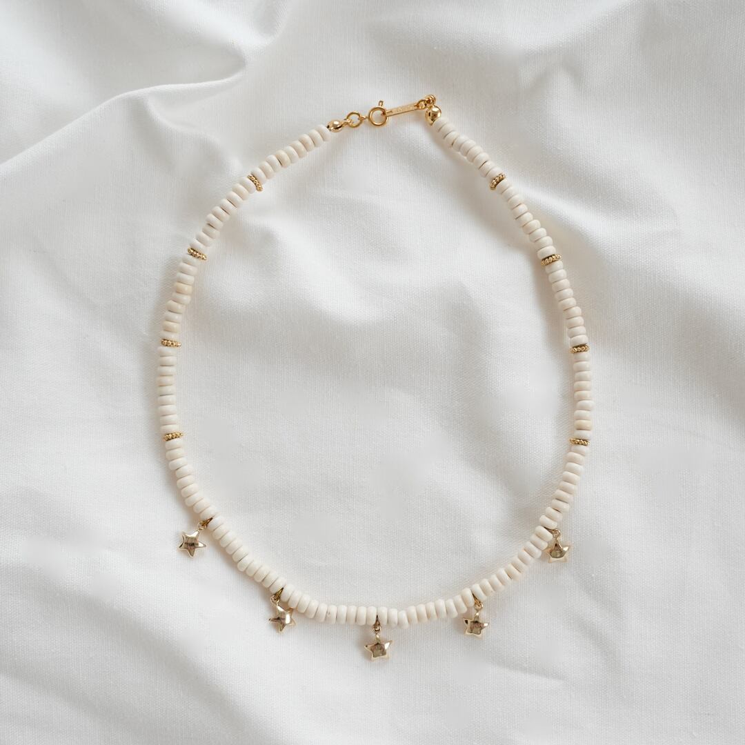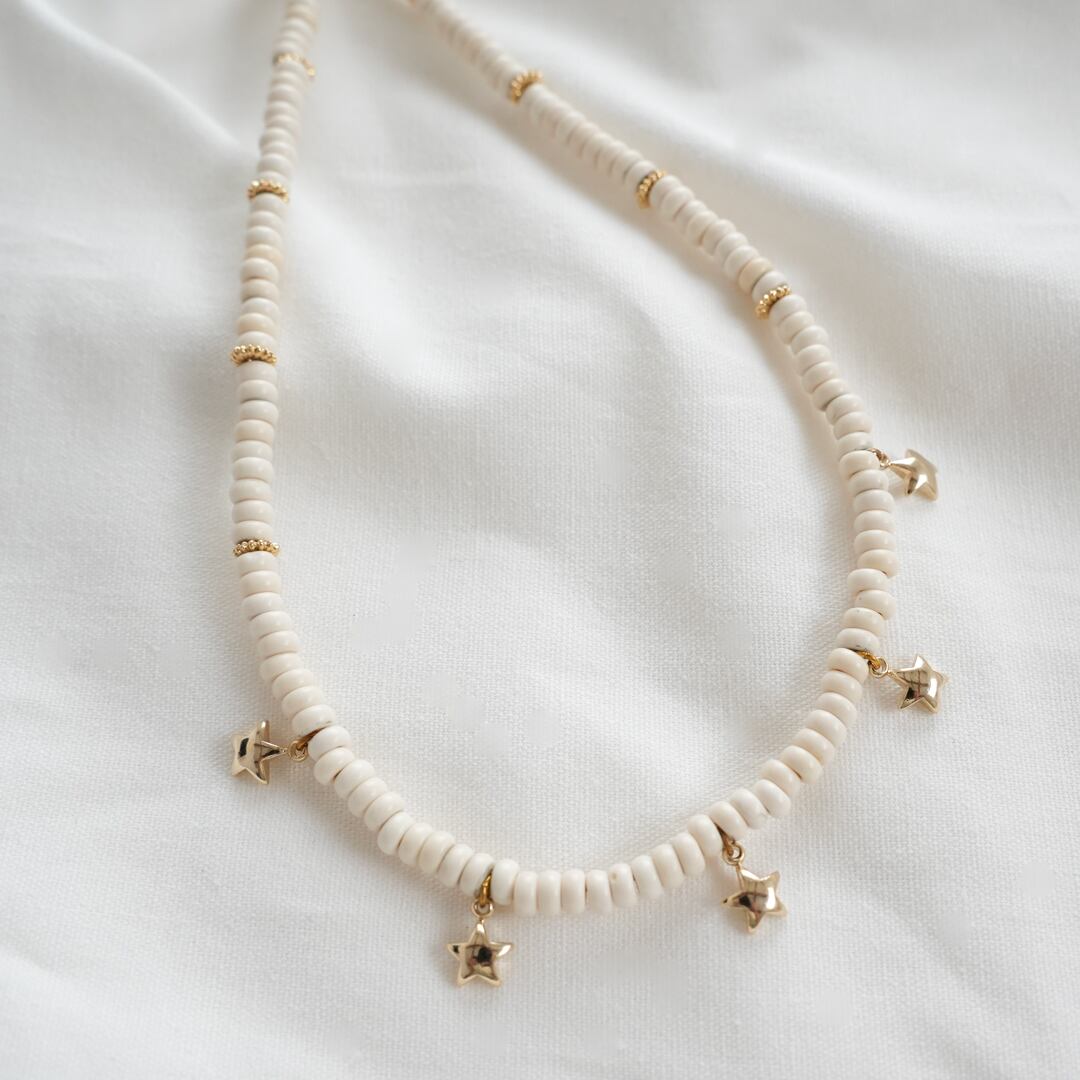 ホワイトのビーズがとても可愛らしく、メタル星パーツがインパクト大のネックレスを制作しました☆35.5cmと少し短めのチョーカーネックレスで他のアクセサリーと重ね付けがおすすめです☆また、お洋服のアクセントにピッタリです!
