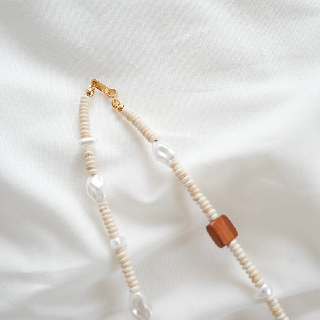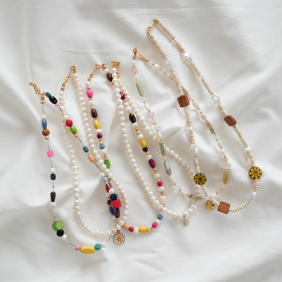 不揃いの樹脂パール、合成石ビーズ、木製ビーズを使用しネックレスを制作しました☆シンプルなお洋服に明るい印象を与えてくれます。また、お手持ちのネックレスにプラスするのもおすすめです☆