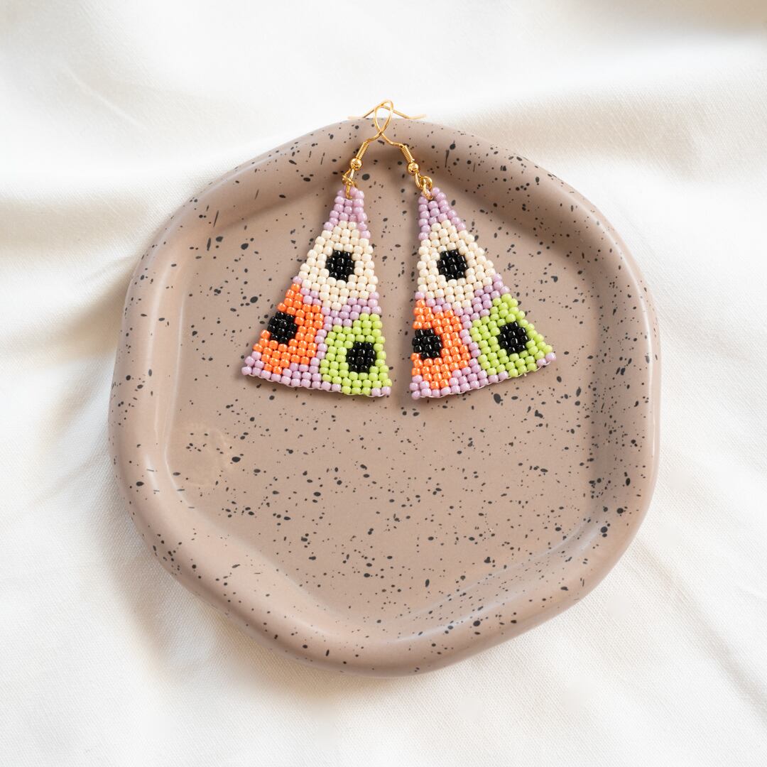 丸小ビーズをたくさん使用しフラワーをモチーフにしたピアスを制作しました。小ぶりですが、フラワーのデザインがとても可愛らしく、お顔周りの印象を明るくしてくれます☆また、他の作品と比べ短めのサイズになっており、より軽く仕上げました。