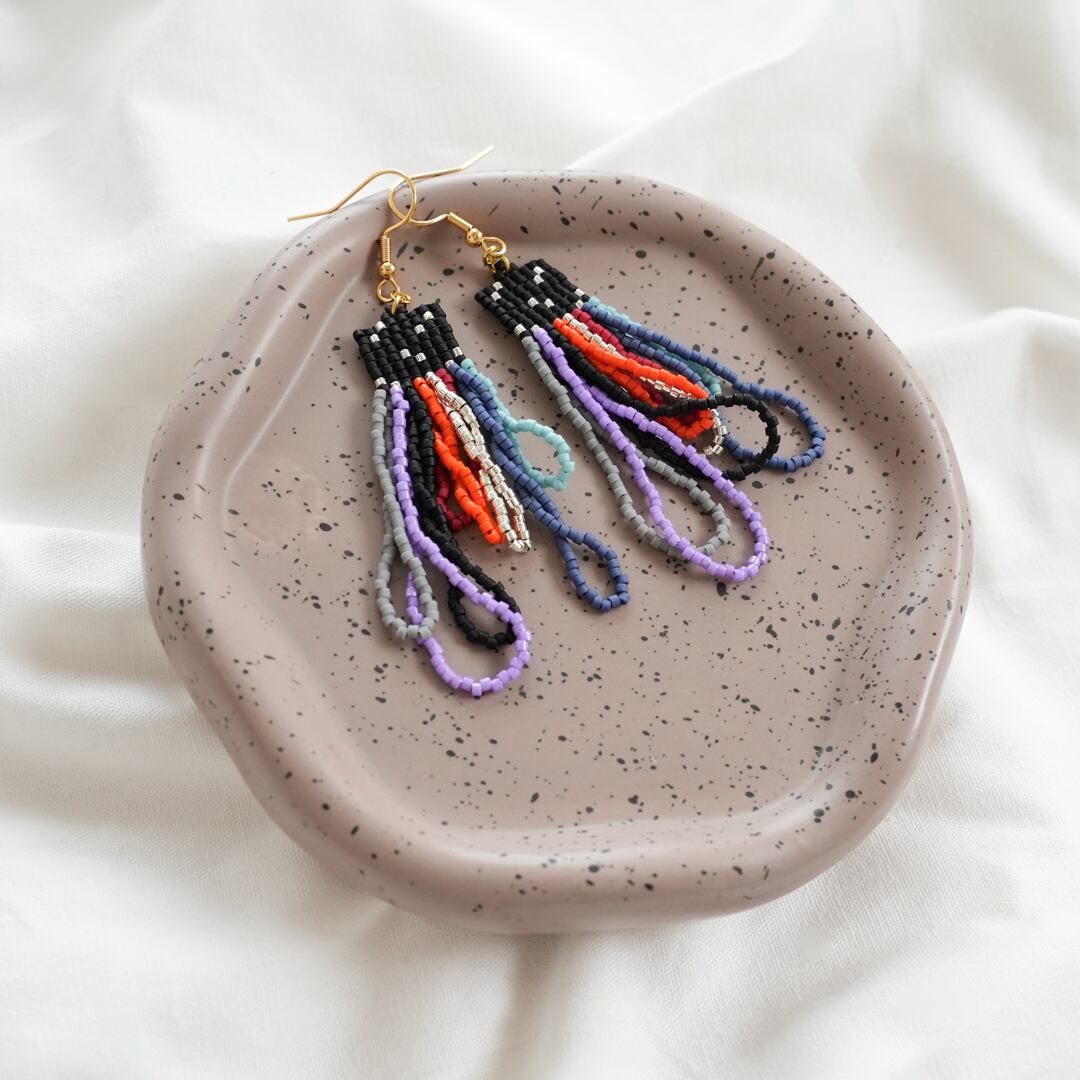 デリカビーズをたくさん使用しカラフルなフリンジビーズピアスを制作しました。小ぶりですが、カラフルなフープフリンジがとても可愛らしく、シルバーとブラックの組み合わせがアクセントになってお顔周りの印象を明るくしてくれます☆また、他の作品と比べ短めのサイズになっており、より軽く仕上げました。