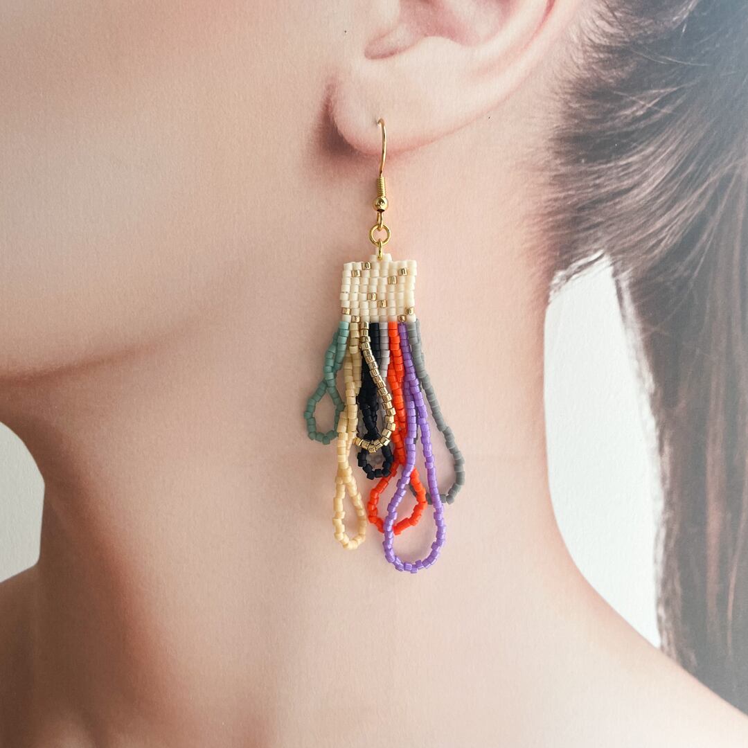 デリカビーズをたくさん使用しカラフルなフリンジビーズピアスを制作しました。小ぶりですが、カラフルなフープフリンジがとても可愛らしく、ゴールドのビーズがアクセントになってお顔周りの印象を明るくしてくれます☆また、他の作品と比べ短めのサイズになっており、より軽く仕上げました。