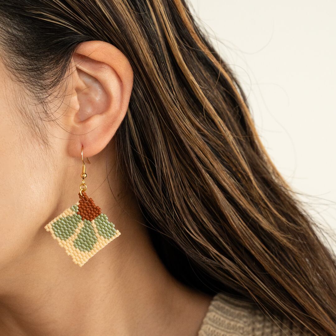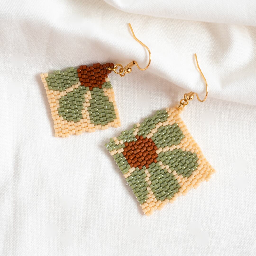 デリカビーズをたくさん使用しフラワーの模様のピアスを制作しました。左右で大きさと、デザインが異なっており、アシンメトリーでとても可愛いです☆