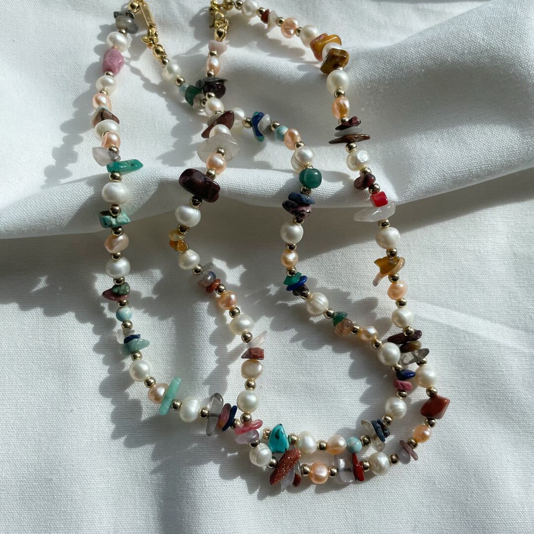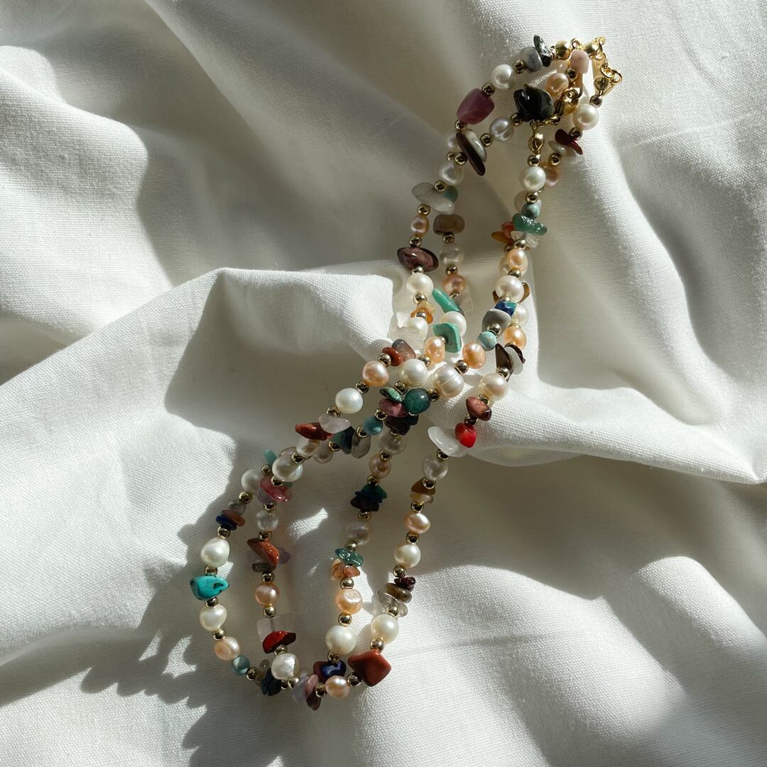 形がそれぞれ違う天然石と淡水パールを組み合わせたネックレスを制作しました♡