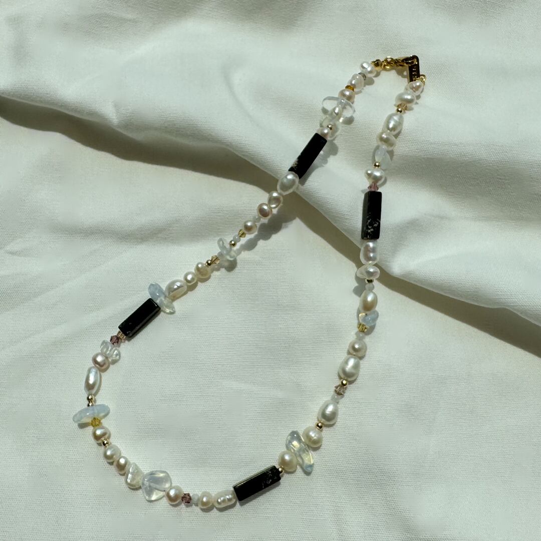 形がそれぞれ違う天然石と淡水パールを組み合わせたネックレスを制作しました♡