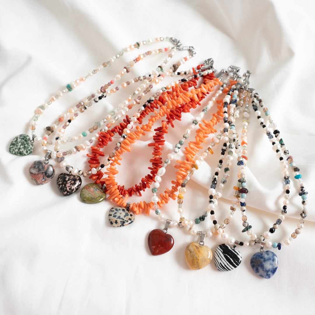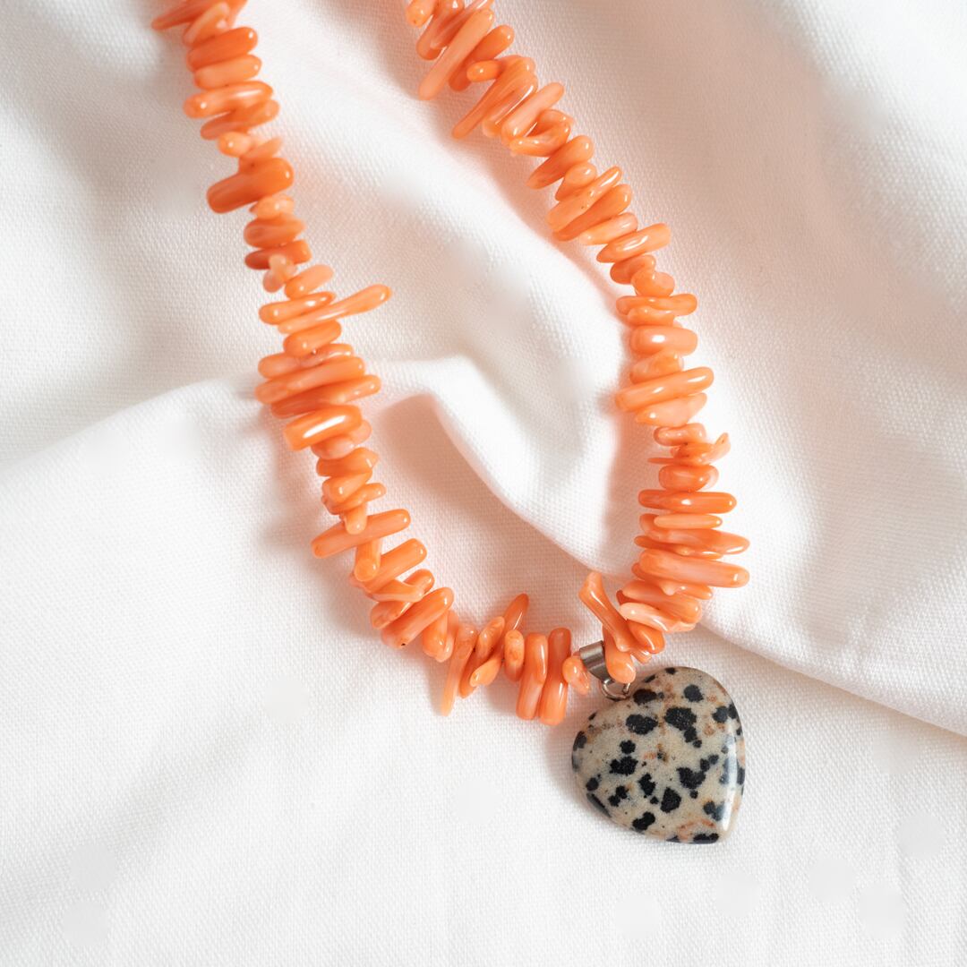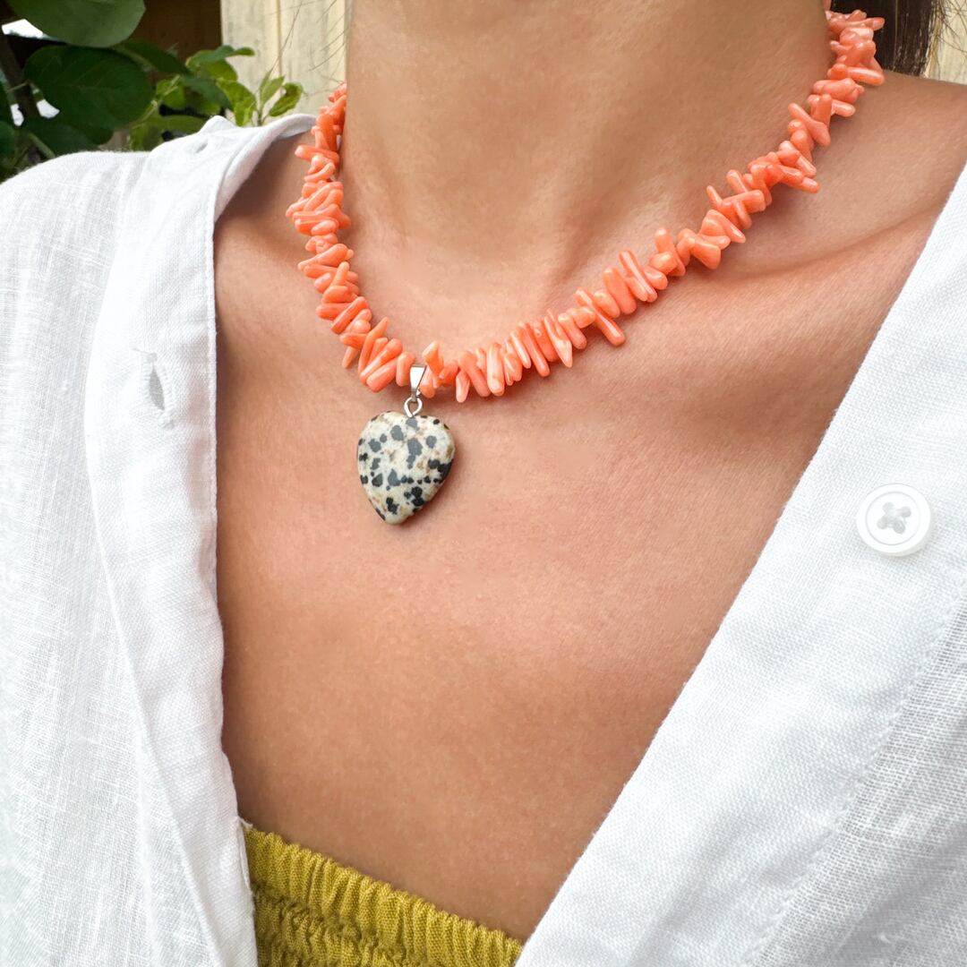 天然石のコーラル(染色)をたくさん使用しネックレスを制作しました♡ダルメシアン柄が可愛いハートのチャームも天然石の素材です。単品で付けて頂いても、お手持ちのネックレスと合わせてもとても可愛いネックレスです☆どの季節でもお洋服に合わせやすく、海・空・自然をイメージしバリ島にて制作致しました。