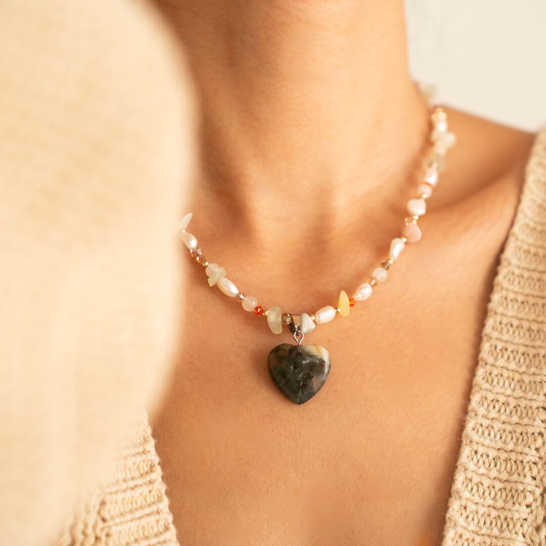 不揃いの天然石をたくさん使用し、淡水パールやガラスビーズと合わせて一点もののネックレスを制作しました♡まだら模様のハートの天然石チャームがポイントで単品でもインパクトがありとても可愛いです♡また、お手持ちのネックレスと重ねて付けて頂くのもおすすめです☆どの季節でもお洋服に合わせやすく、海・空・自然をイメージし制作致しました。