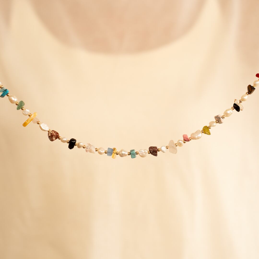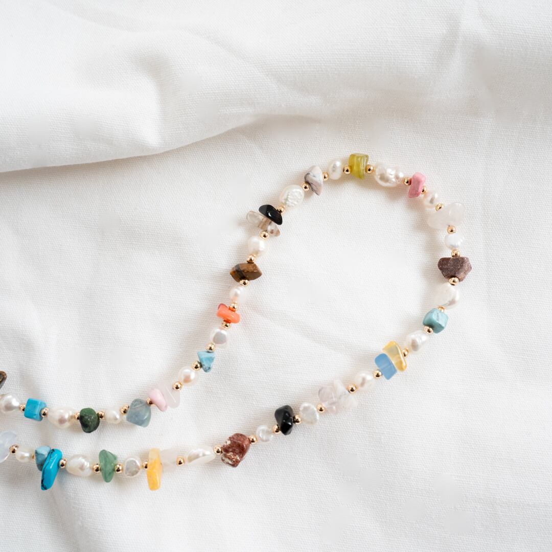 形がそれぞれ違うカラフルな天然石と淡水パールを組み合わせたネックレスを制作しました♡
