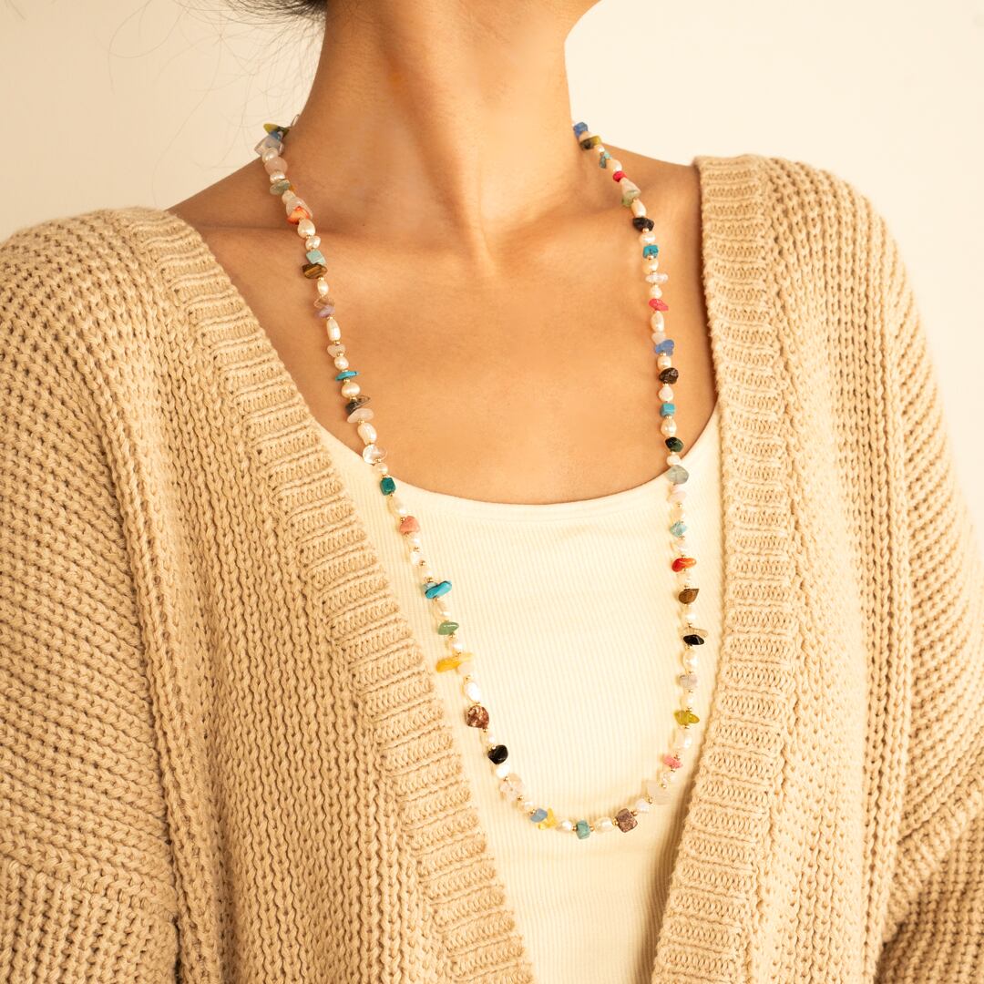 【1点限り】淡水パール・カラフル天然石 2way ロングネックレス/76cm